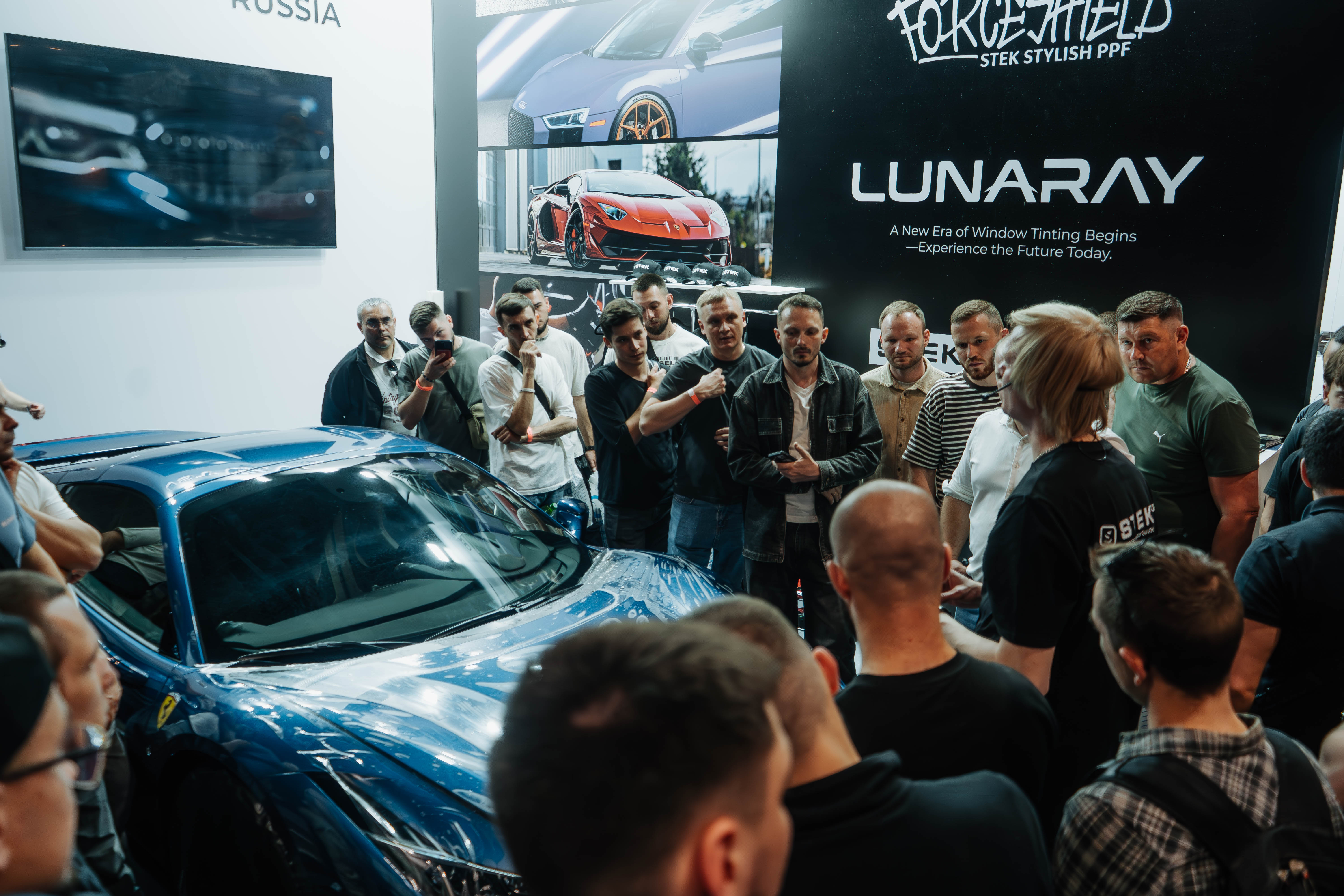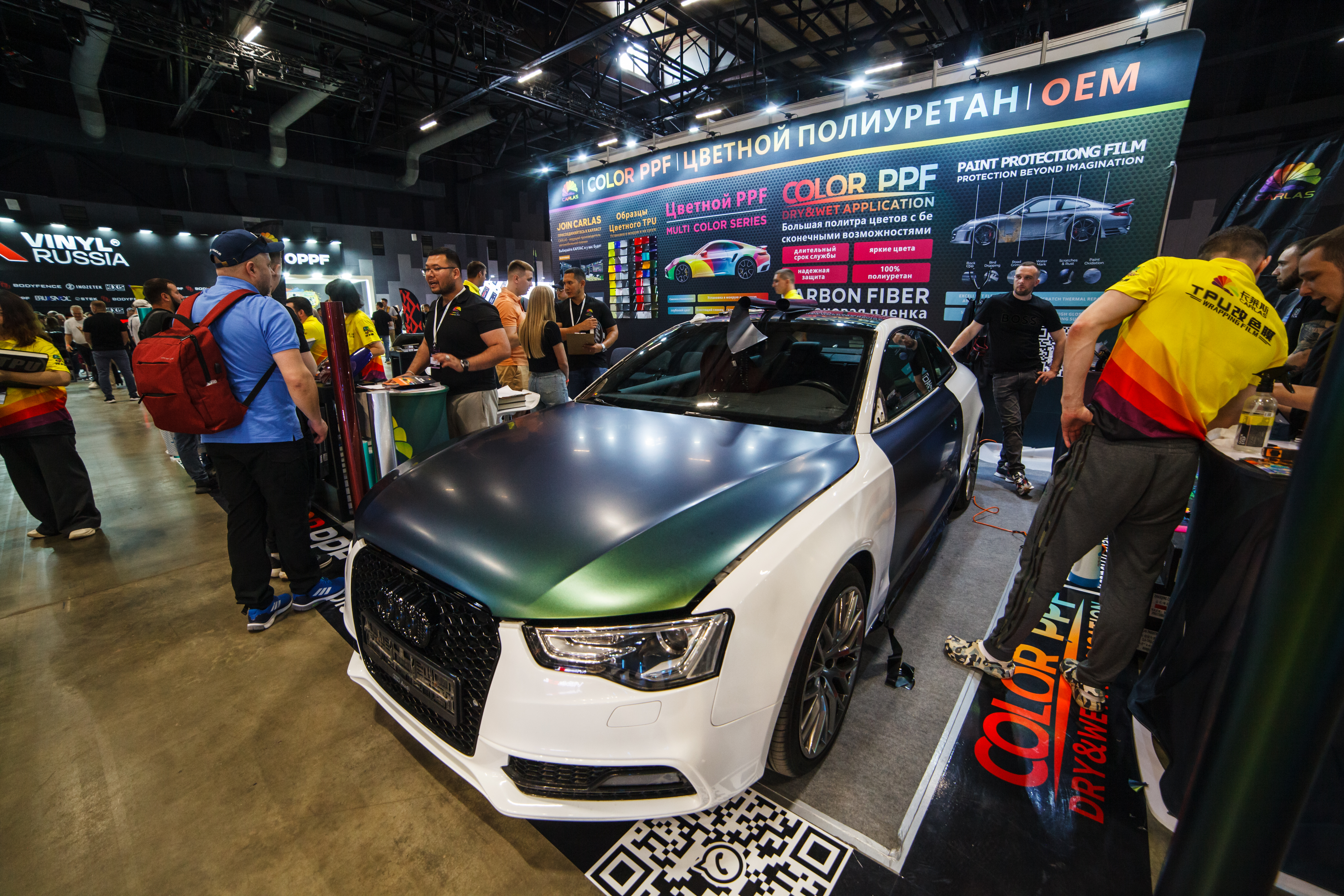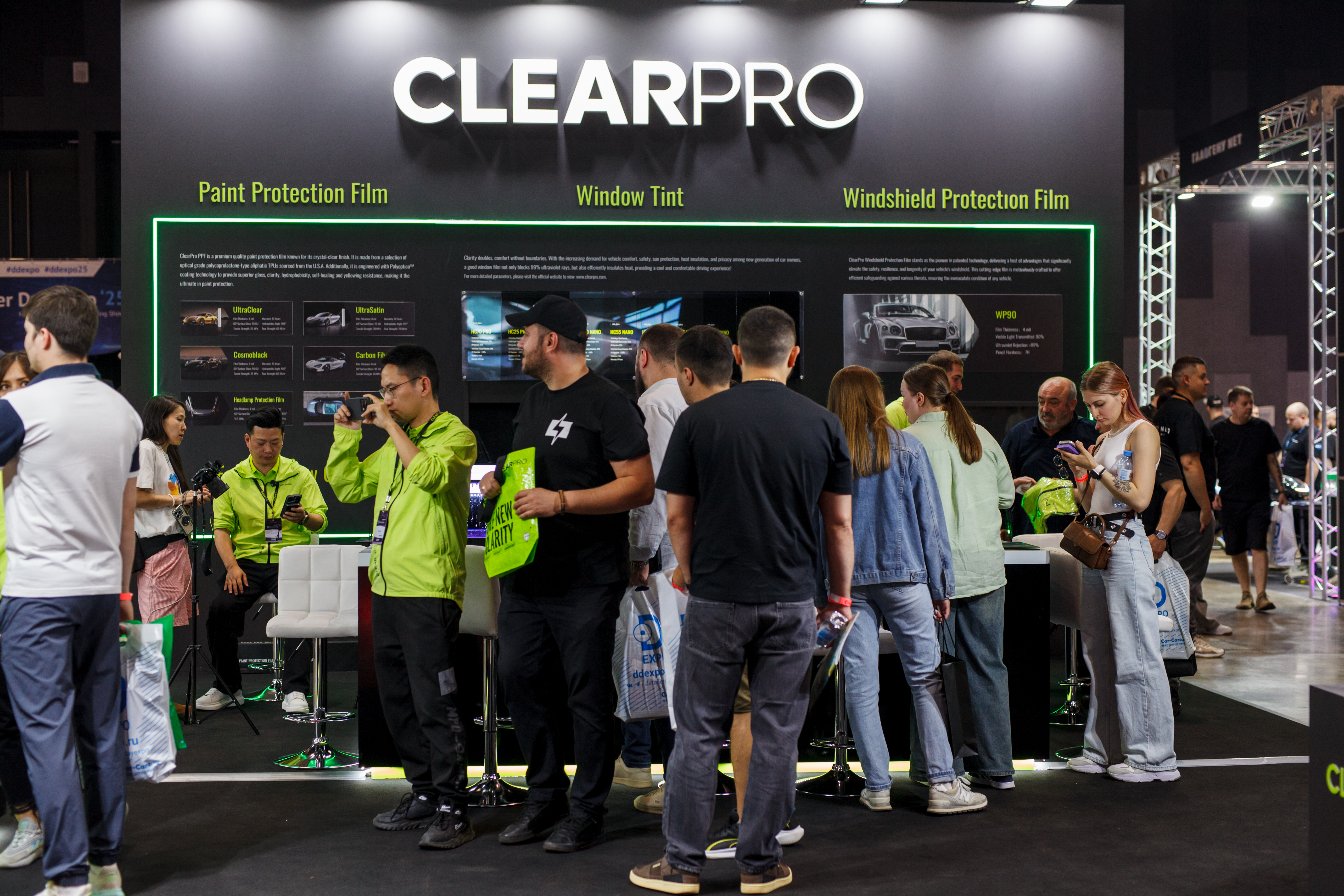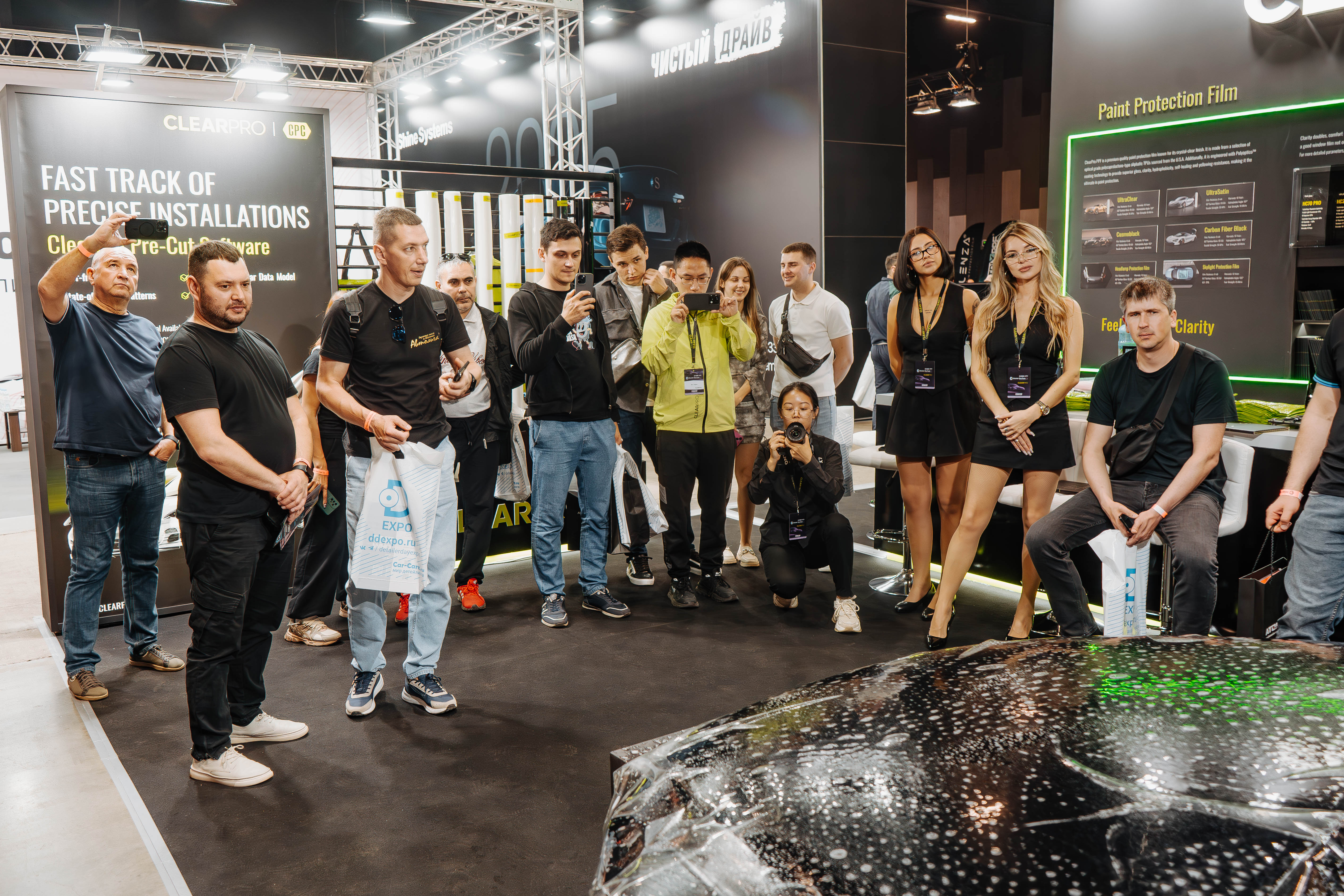 На стенде бренда — консультации от представителей головного офиса из Китая, широкий ассортимент образцов, демонстрация и тестирование пленок, наглядная оценка защитных свойств полиуретана под воздействием гравилометра.